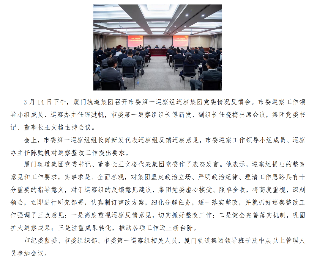 厦门轨道集团召开市委第一巡察组巡察集团党委情况反馈会