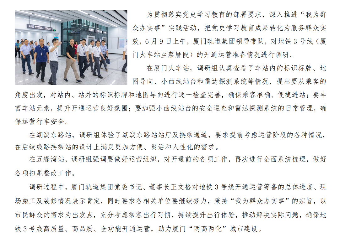 以群众需求为出发点,优化提升出行体验——厦门轨道集团领导调研地铁3号线开通运营准备情况