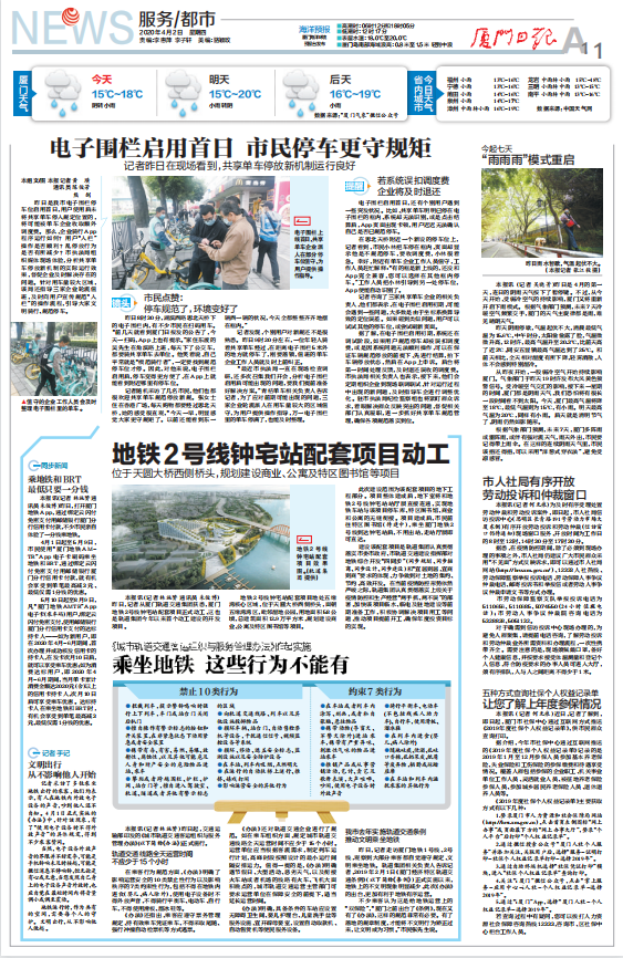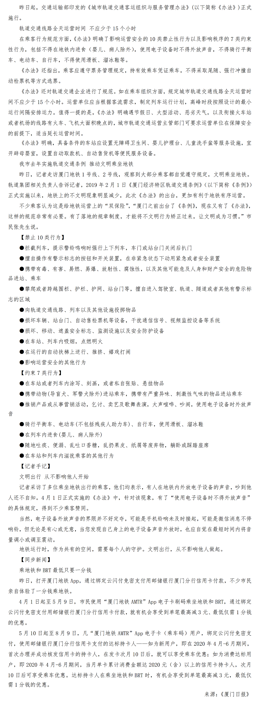 【厦门日报】:《城市轨道交通客运组织与服务管理办法》昨起实施,乘坐地铁这些行为不能有