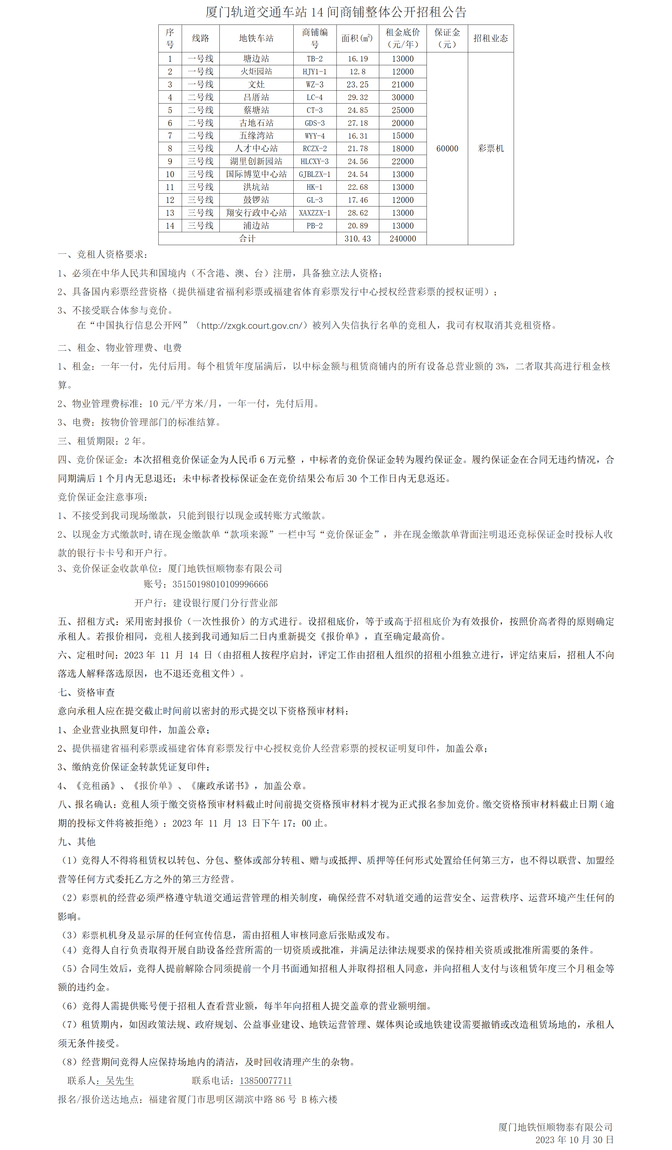 厦门轨道交通车站14间商铺整体公开招租公告