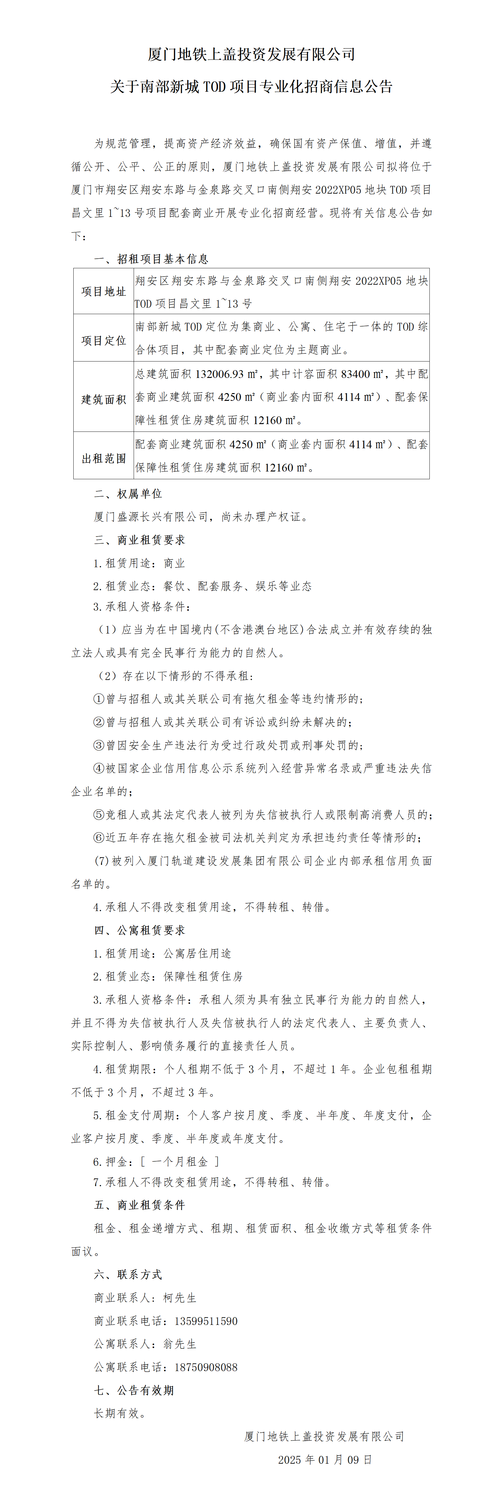 厦门地铁上盖投资发展有限公司关于南部新城 TOD 项目专业化招商信息公告