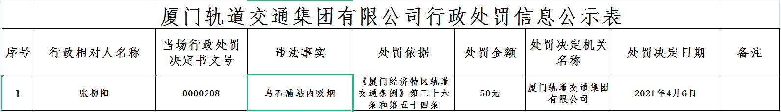 厦门轨道交通集团有限公司行政处罚信息公示(2021.4.7-2021.4.13)