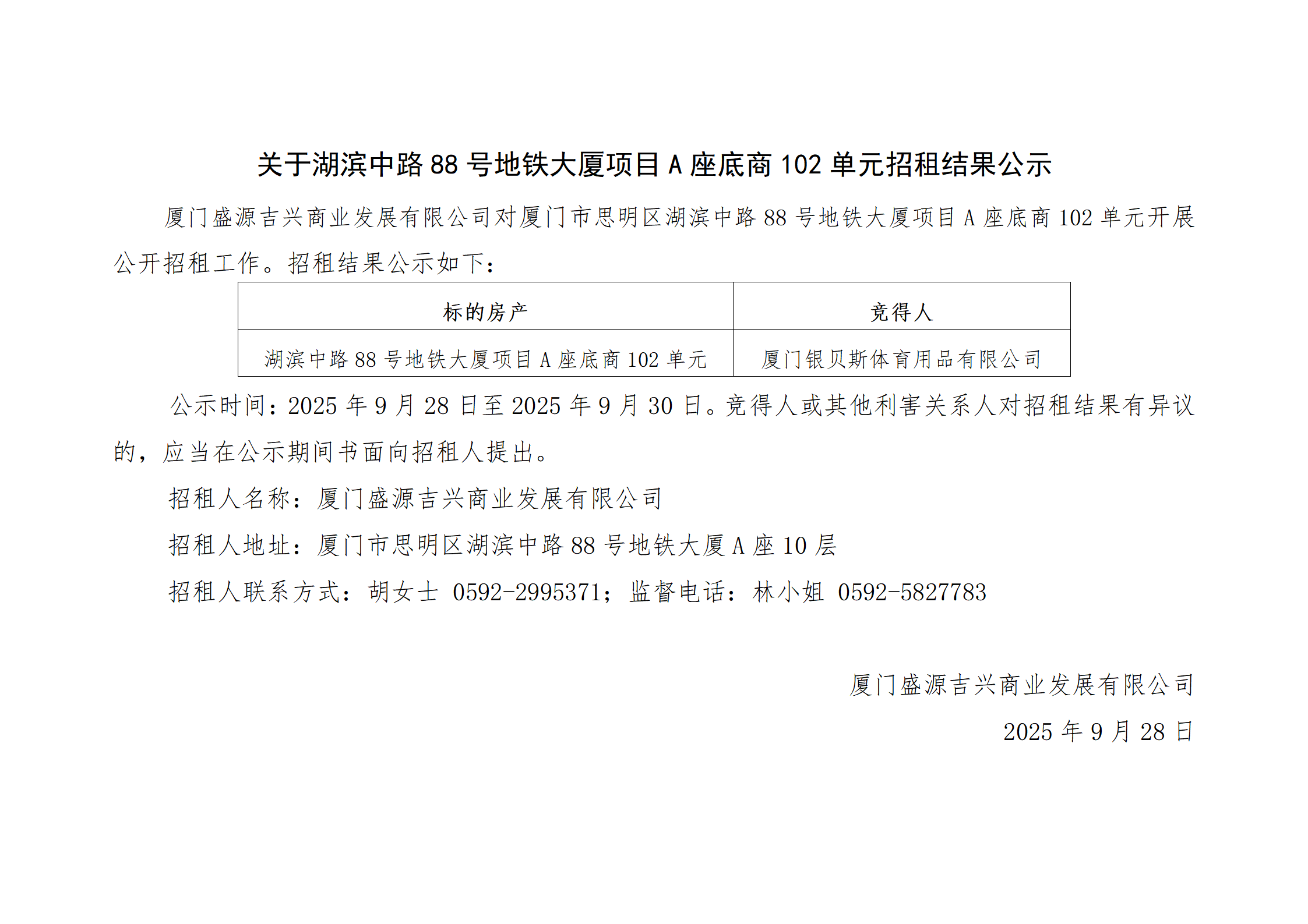关于湖滨中路88号地铁大厦项目A座底商102单元招租结果公示