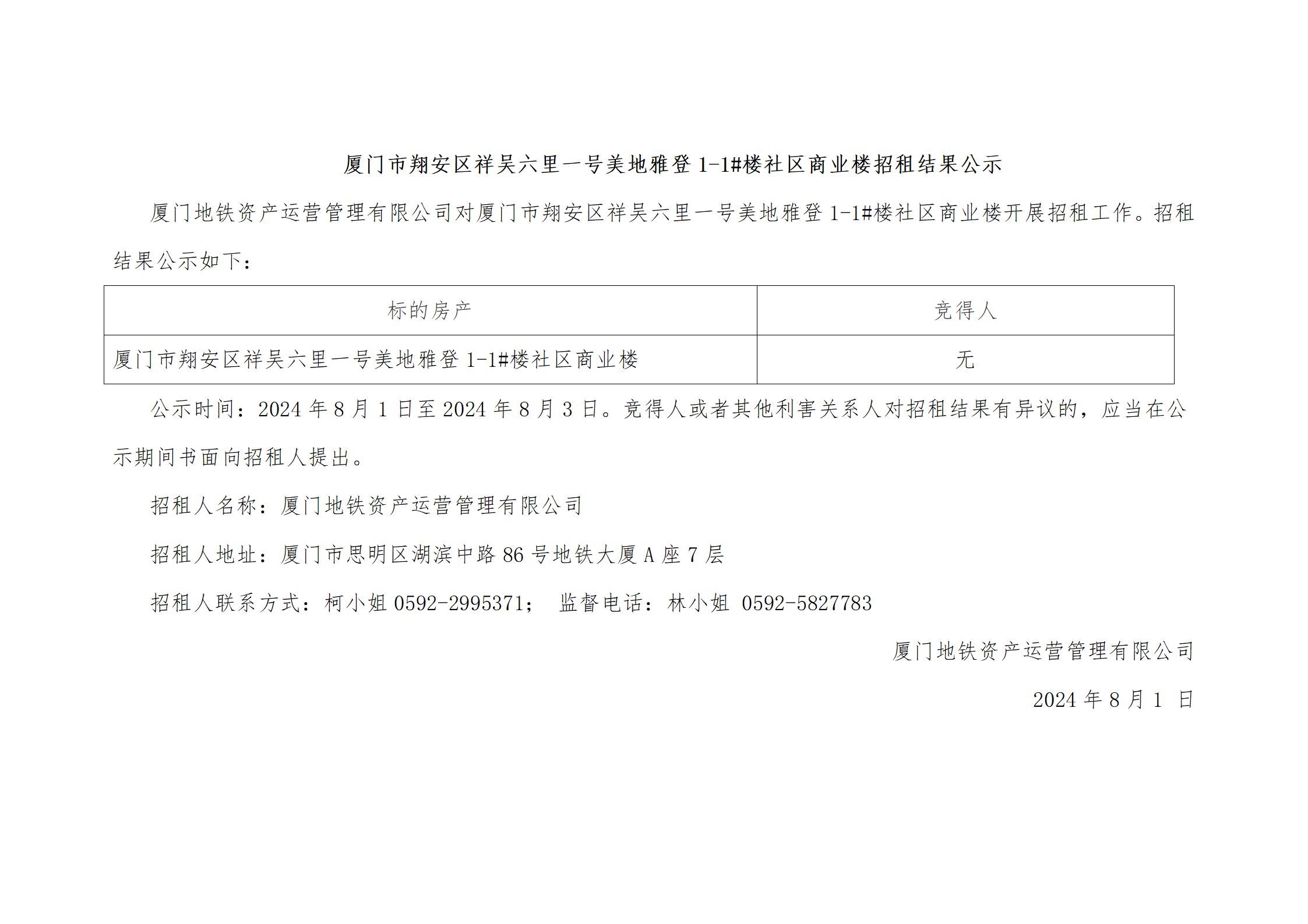 厦门市翔安区祥吴六里一号美地雅登1-1#楼社区商业楼招租结果公示