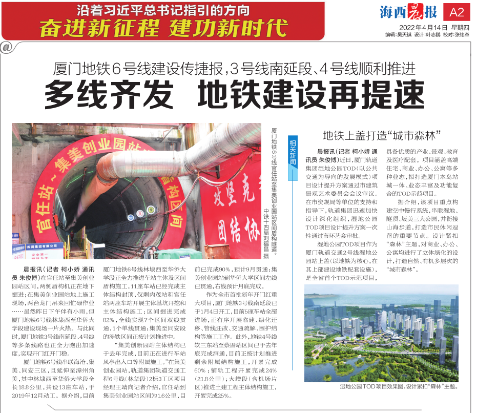 厦门地铁6号线串联海沧、集美、同安三区,且延伸至漳州角美,其中林埭西至华侨大学段全长18.8公里,共设13座车站,于2019年12月动工。据介绍,目前厦门地铁6号线林埭西至华侨大学段正全力推进车站主体及区间盾构施工,11座车站已经完成主体结构封顶,仅剩内茂站和官任站两座车站开展主体基坑开挖和主体结构施工;区间掘进完成82%,全线实现7个区间双线贯通,1个单线贯通;集美至同安段的涉铁区间正按计划推进中。