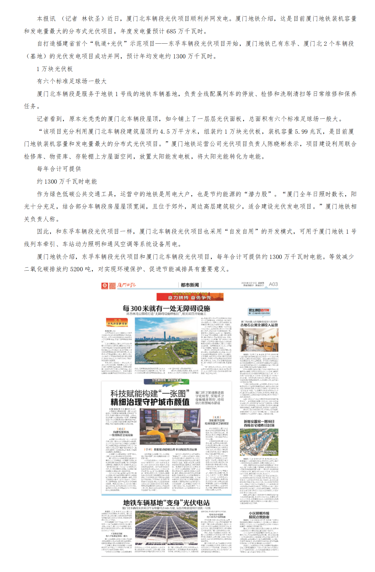 【厦门日报】地铁车辆基地“变身”光伏电站