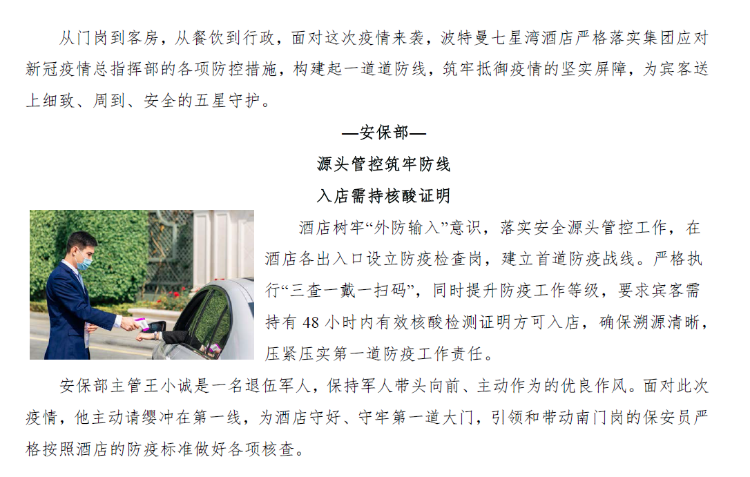 波特曼七星湾酒店的安心服务 五星守护宾客安全