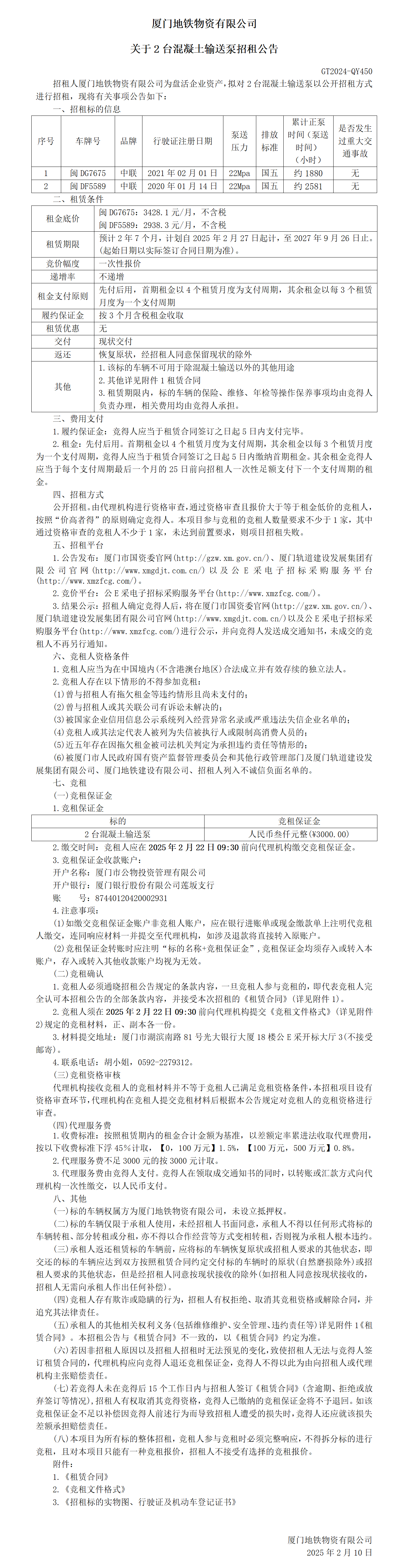 厦门地铁物资有限公司关于2台混凝土输送泵招租公告