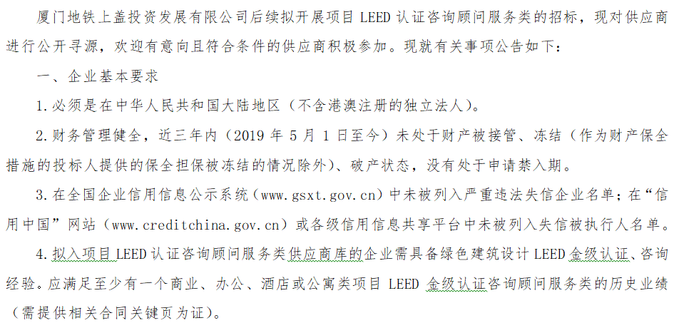 关于项目LEED认证咨询顾问服务类供应商的寻源公告