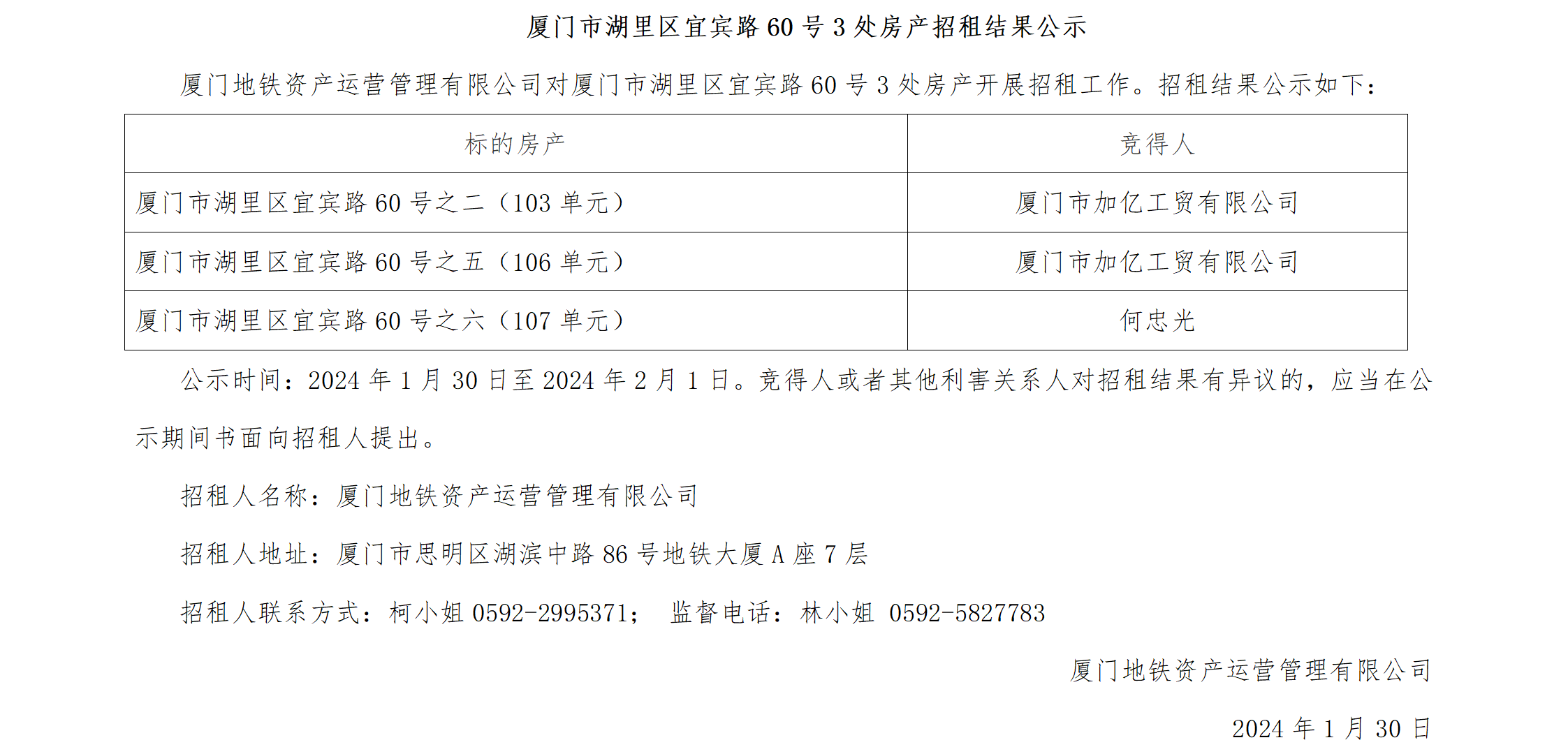 厦门市湖里区宜宾路60号3处房产招租结果公示