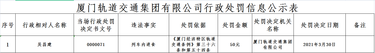 厦门轨道交通集团有限公司行政处罚信息公示(2021.3.31-2021.4.6)