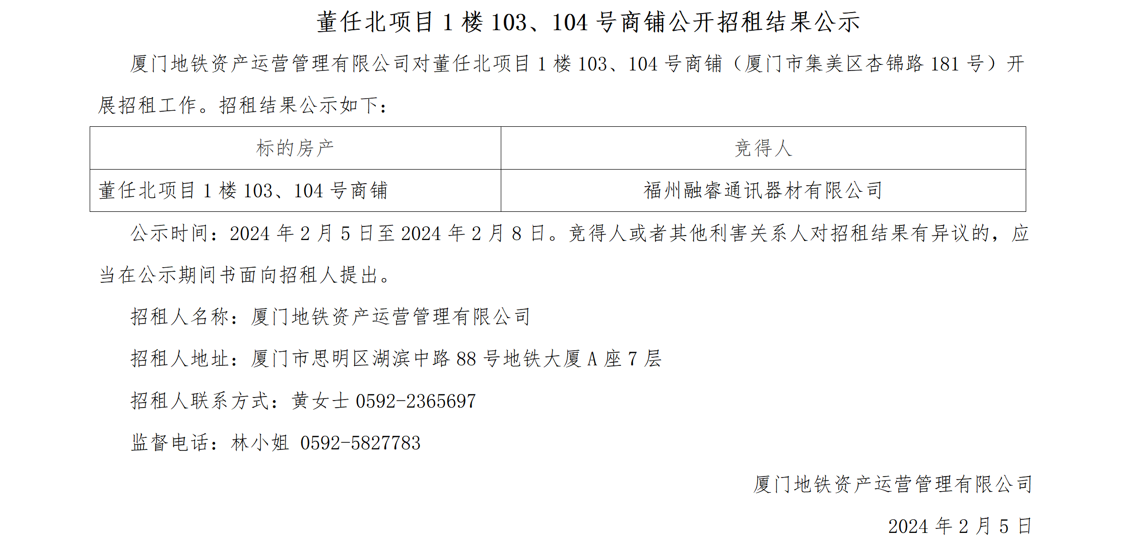 董任北项目1楼103、104号商铺公开招租结果公示