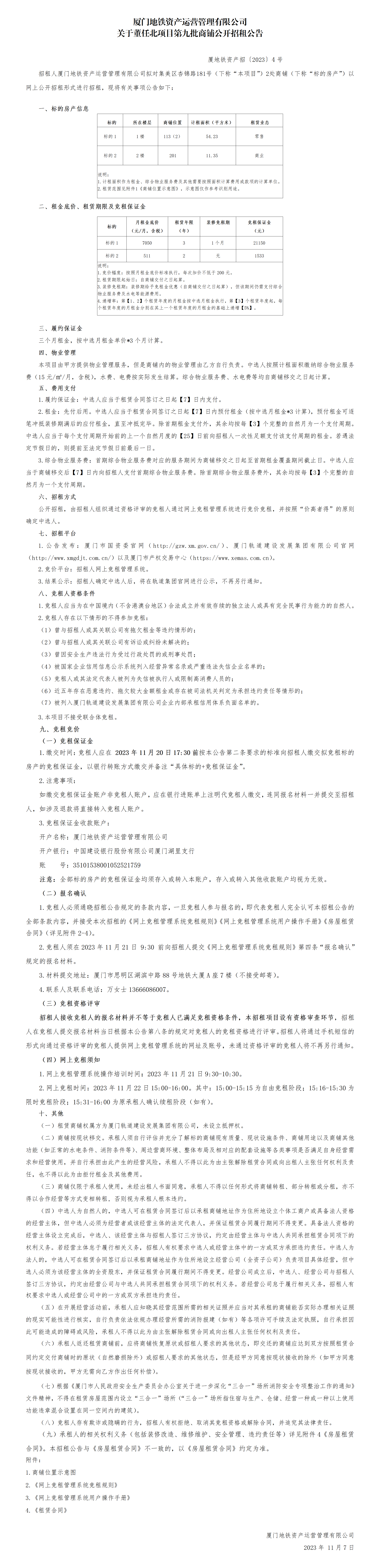 厦门地铁资产运营管理有限公司关于董任北项目第九批商铺公开招租公告