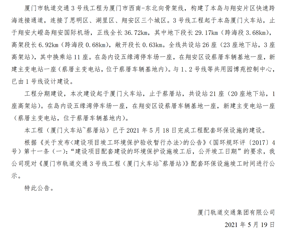 关于“厦门市轨道交通3号线工程(厦门火车站~蔡厝站)”环保设施竣工时间的公示