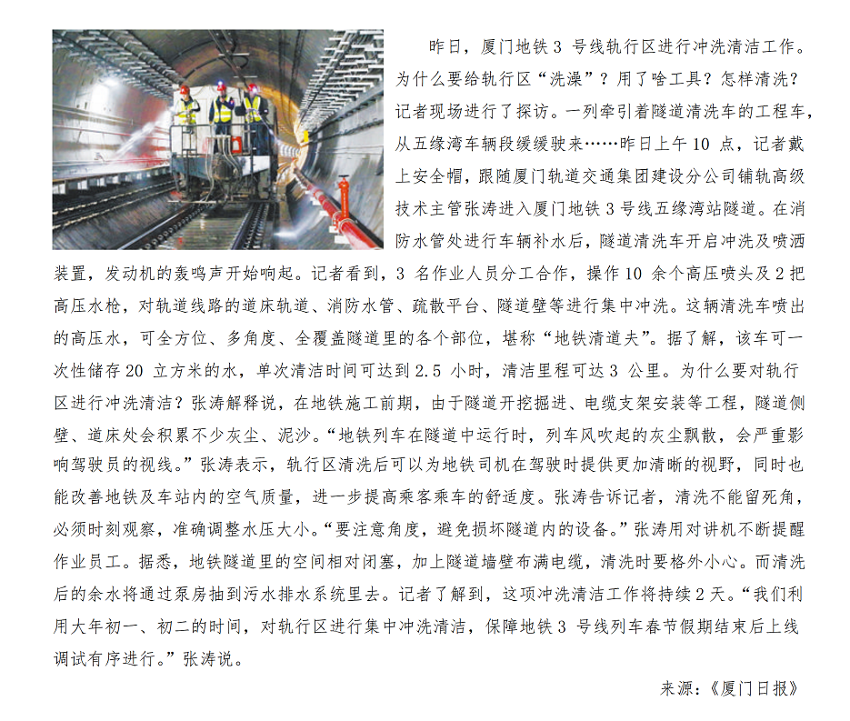【厦门日报】:地铁3号线隧道春节“洗澡”