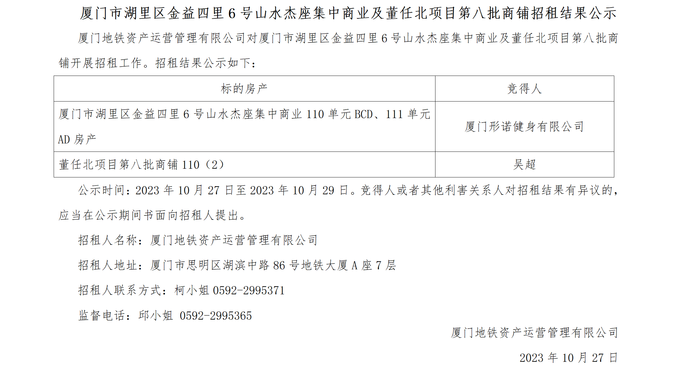 厦门市湖里区金益四里6号山水杰座集中商业及董任北项目第八批商铺招租结果公示