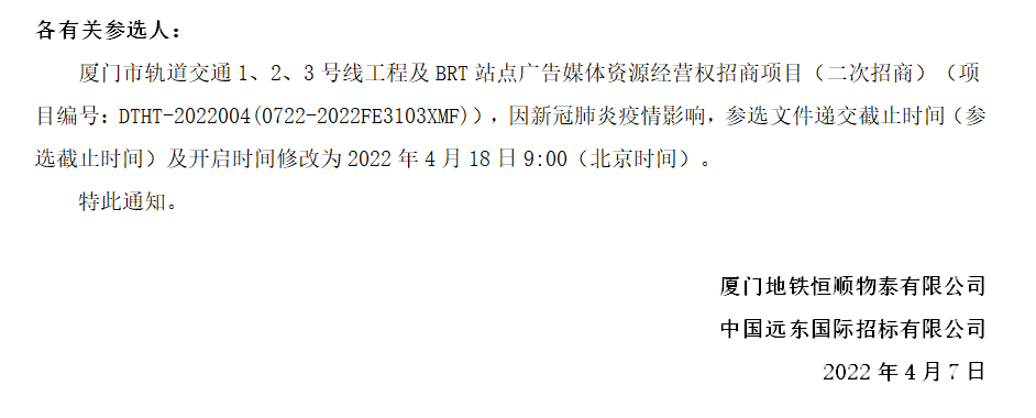 关于厦门市轨道交通1、2、3号线工程及BRT站点广告媒体资源经营权招商项目(二次招商)的补充通知(二)