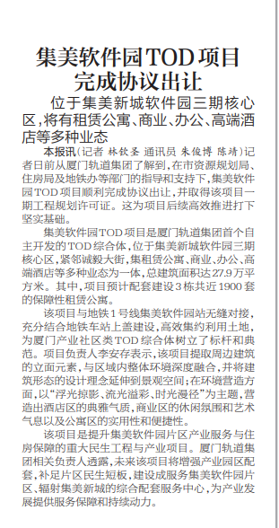 本报讯(记者 林钦圣 通讯员 朱俊博 陈靖)记者日前从厦门轨道集团了解到,在市资源规划局、住房局及地铁办等部门的指导和支持下,集美软件园TOD项目顺利完成协议出让,并取得该项目一期工程规划许可证。这为项目后续高效推进打下坚实基础。