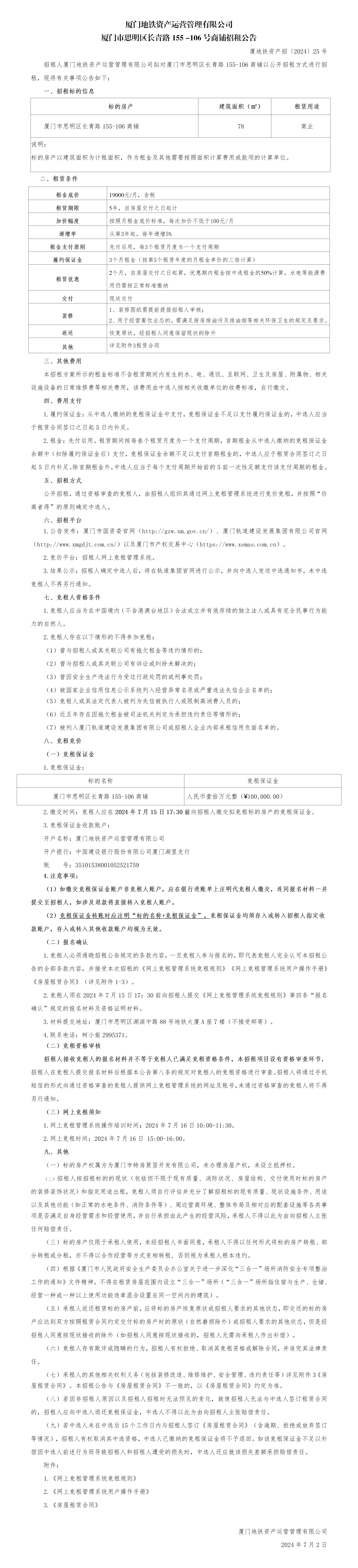 厦门地铁资产运营管理有限公司关于厦门市思明区长青路155 -106号商铺招租公告