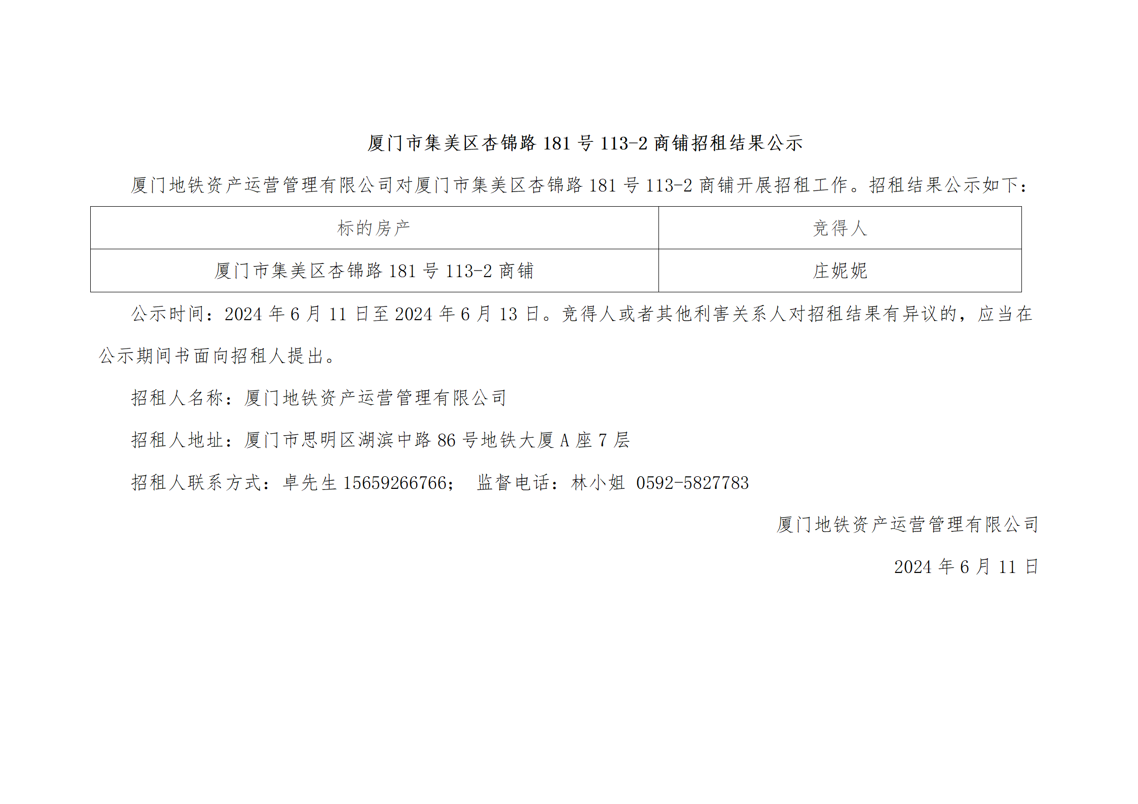 厦门地铁资产运营管理有限公司关于厦门市集美区杏锦路181号113-2商铺招租结果公示