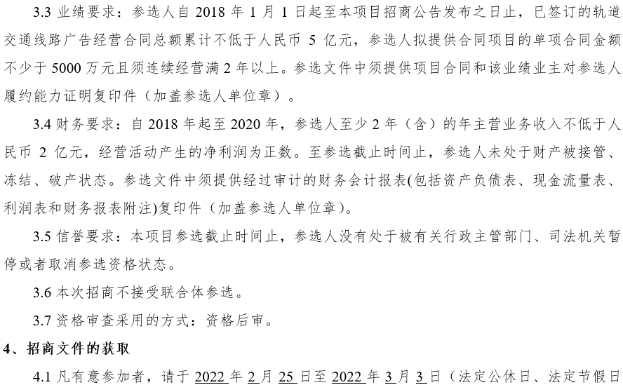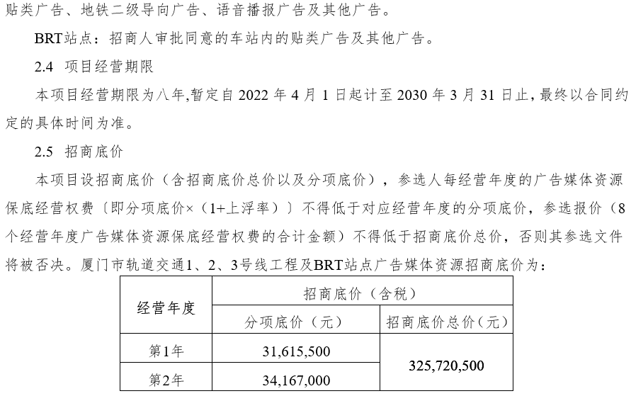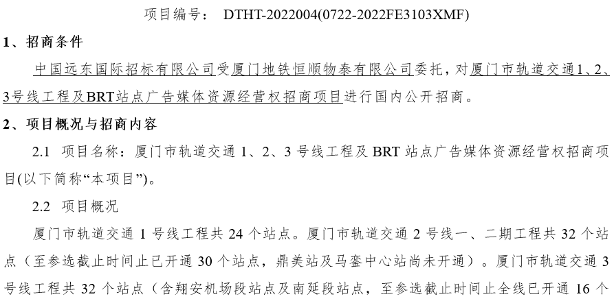 厦门市轨道交通1、2、3号线工程及BRT站点广告媒体资源经营权招商项目招商公告(重新公告)