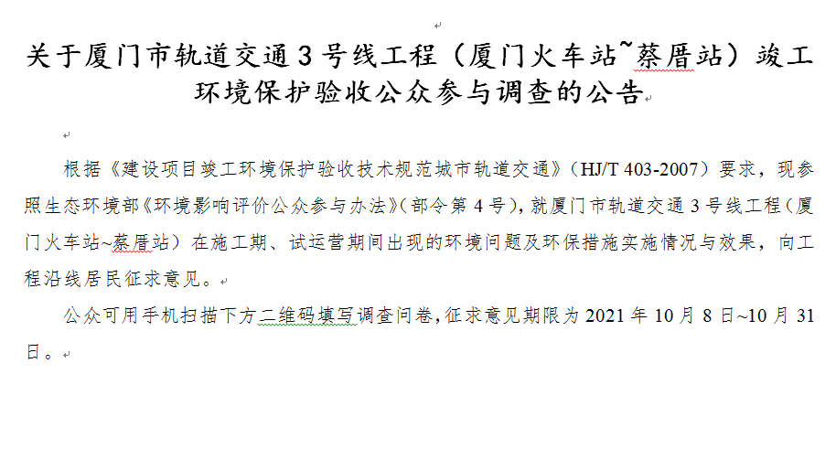 关于厦门市轨道交通3号线工程(厦门火车站~蔡厝站)竣工环境保护验收公众参与调查的公告