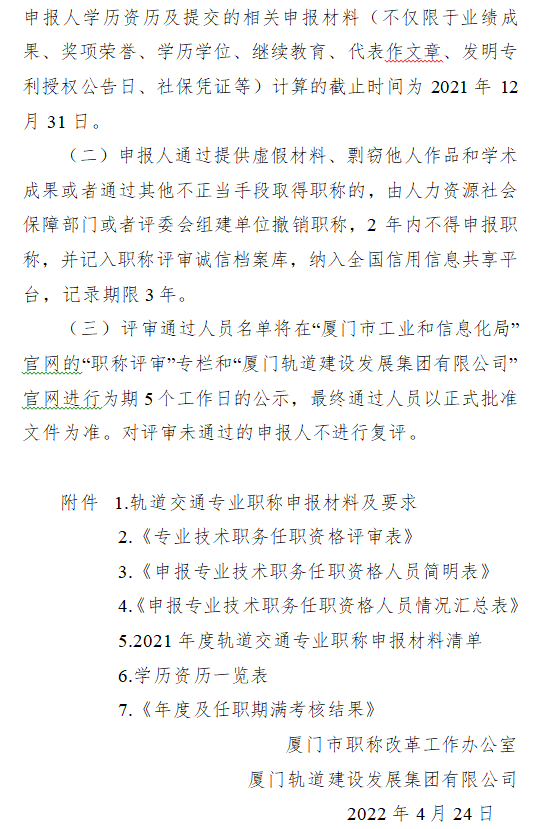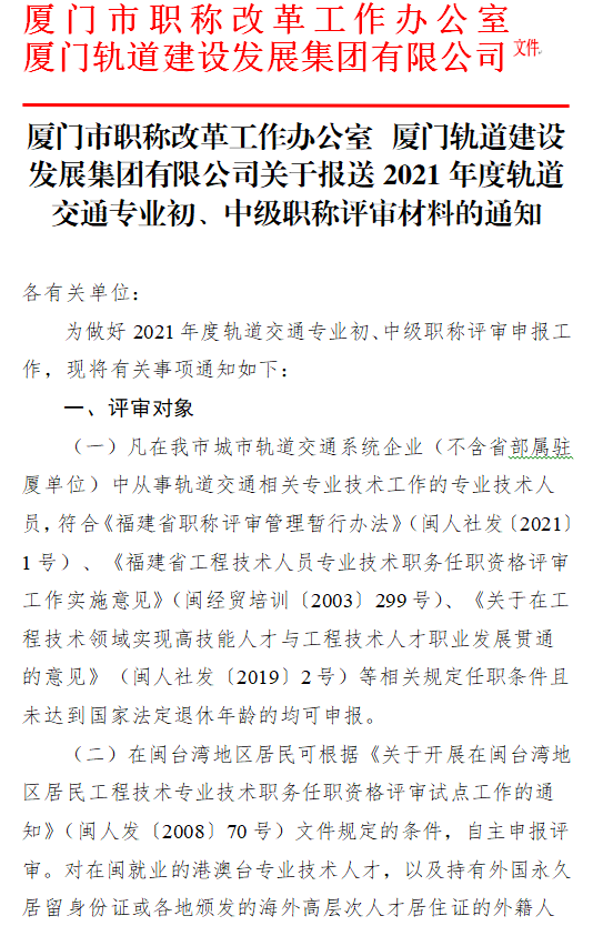 厦门市职称改革工作办公室 厦门轨道建设发展集团有限公司关于报送2021年度轨道交通专业初、中级职称评审材料的通知