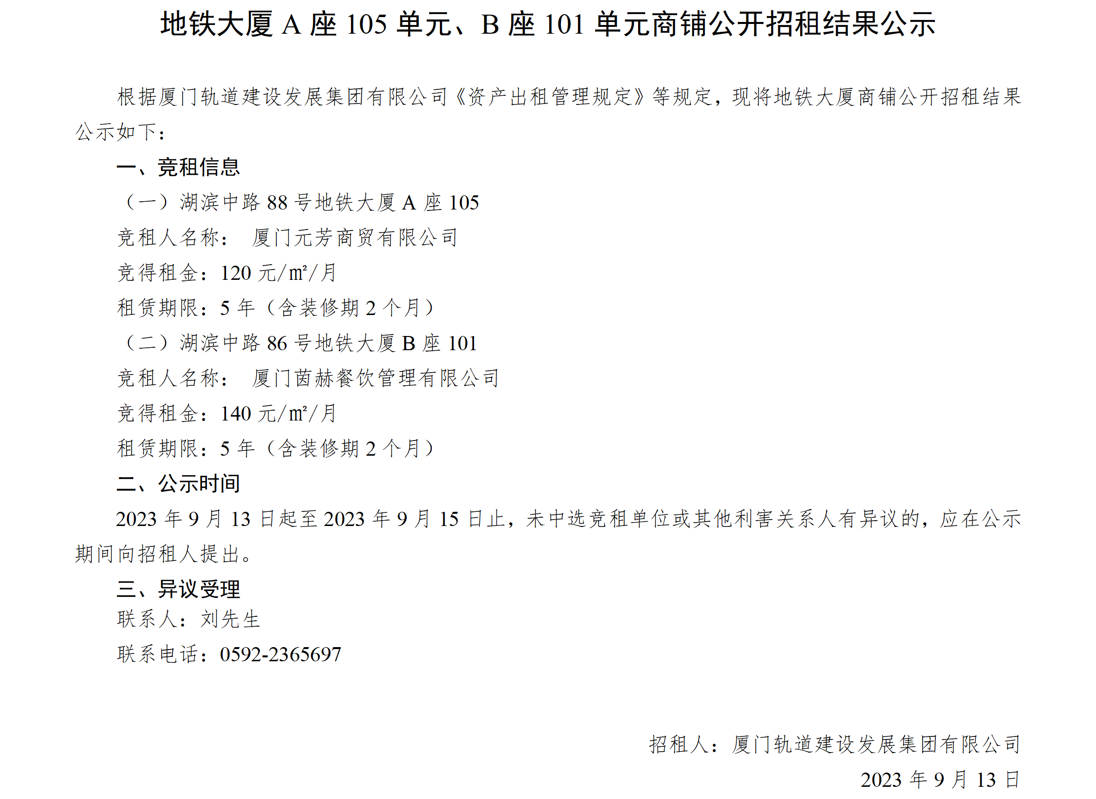 地铁大厦A座105单元、B座101单元商铺公开招租结果公示