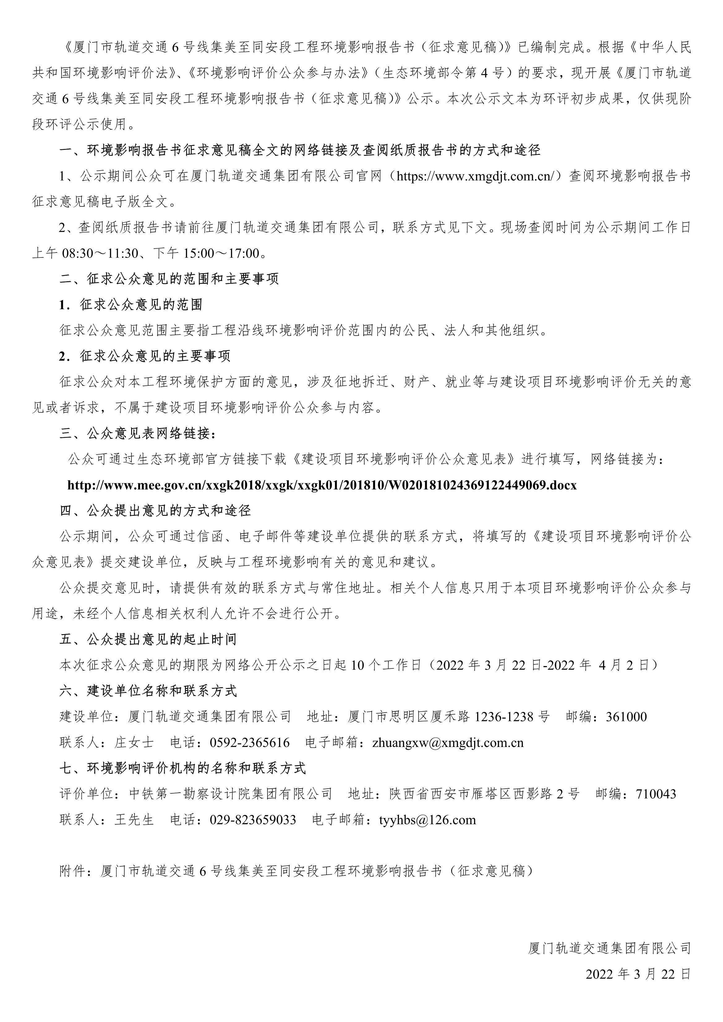 厦门市轨道交通6号线集美至同安段工程环境影响报告书征求意见稿公示