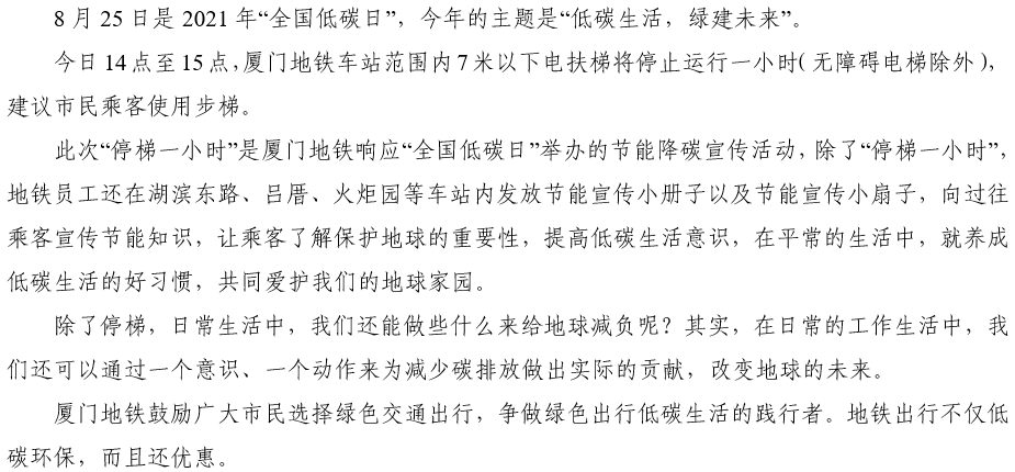 2021年全国低碳日,厦门地铁站内部分电扶梯将暂停一小时