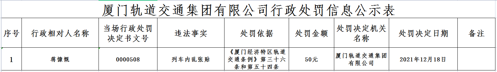 厦门轨道交通集团有限公司行政处罚信息公示(2021.12.15-2021.12.21)