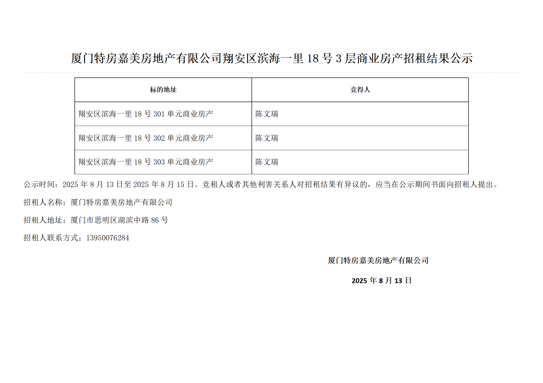 厦门特房嘉美房地产有限公司翔安区滨海一里18号3层部分商业房产招租结果公示