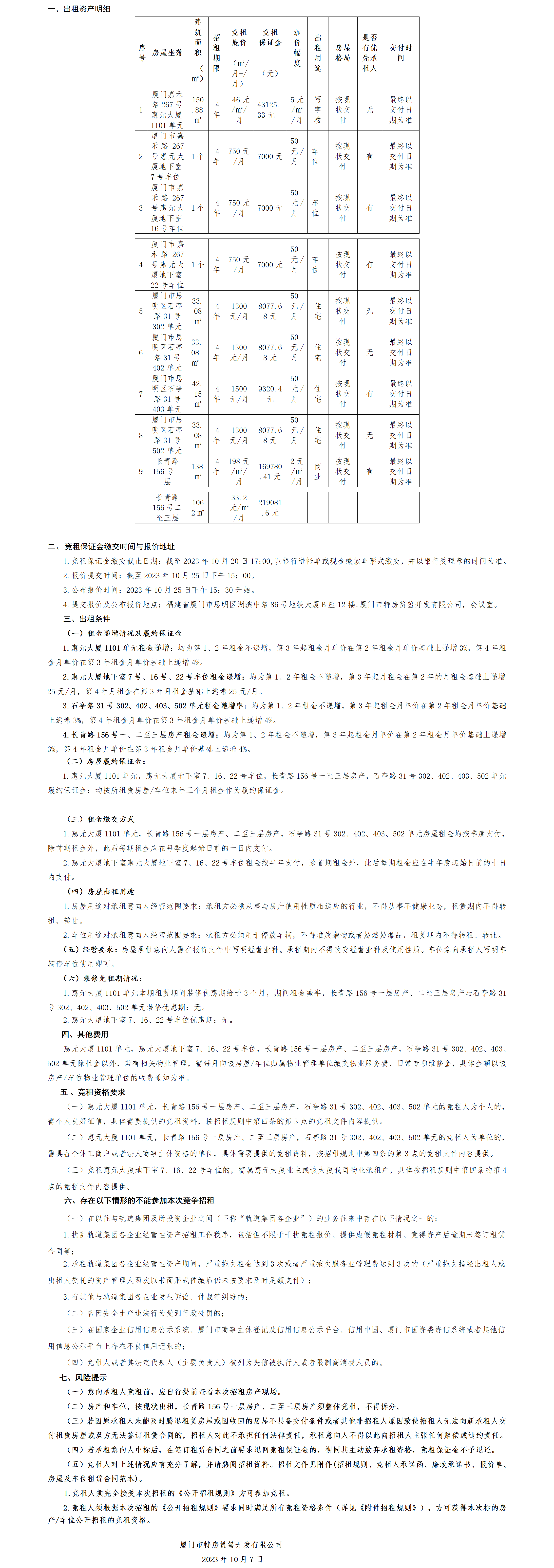 2023年第四期厦门市特房筼筜开发有限公司位于惠元大厦等9处资产招租信息