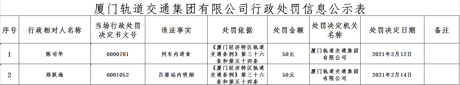 厦门轨道交通集团有限公司行政处罚信息公示(2021.2.14-2021.2.21)