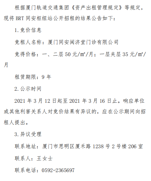 BRT同安枢纽站公开招租结果公示
