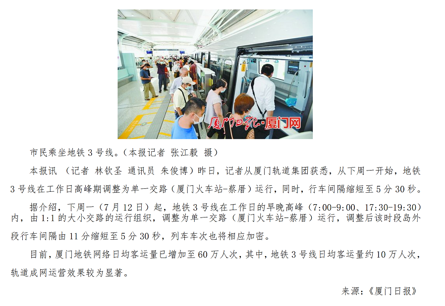 【厦门日报】:工作日高峰期地铁3号线车次加密