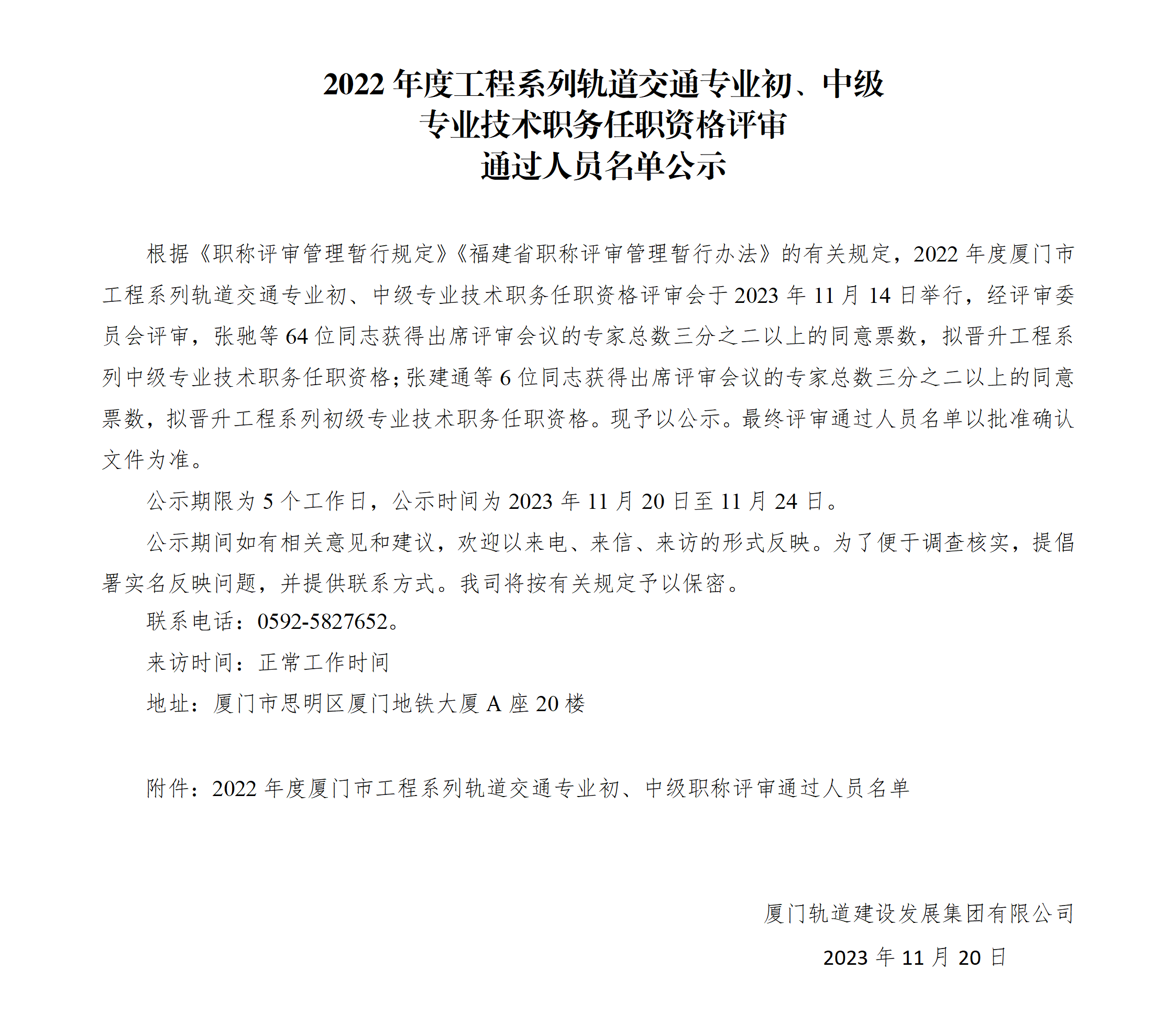 2022年度工程系列轨道交通专业初、中级专业技术职务任职资格评审通过人员名单公示