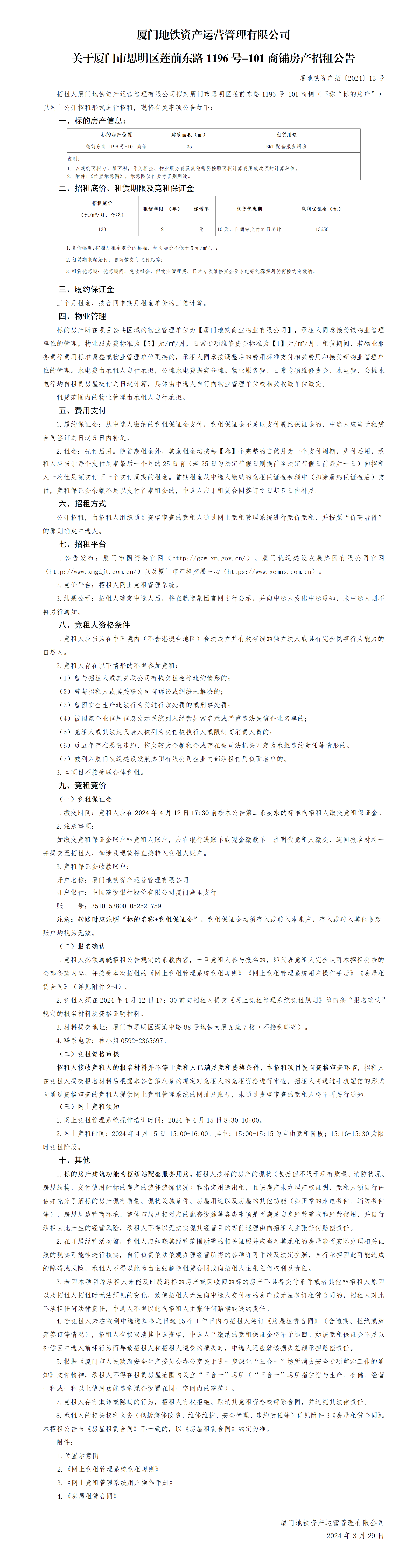 厦门地铁资产运营管理有限公司关于厦门市思明区莲前东路1196号-101商铺房产招租公告