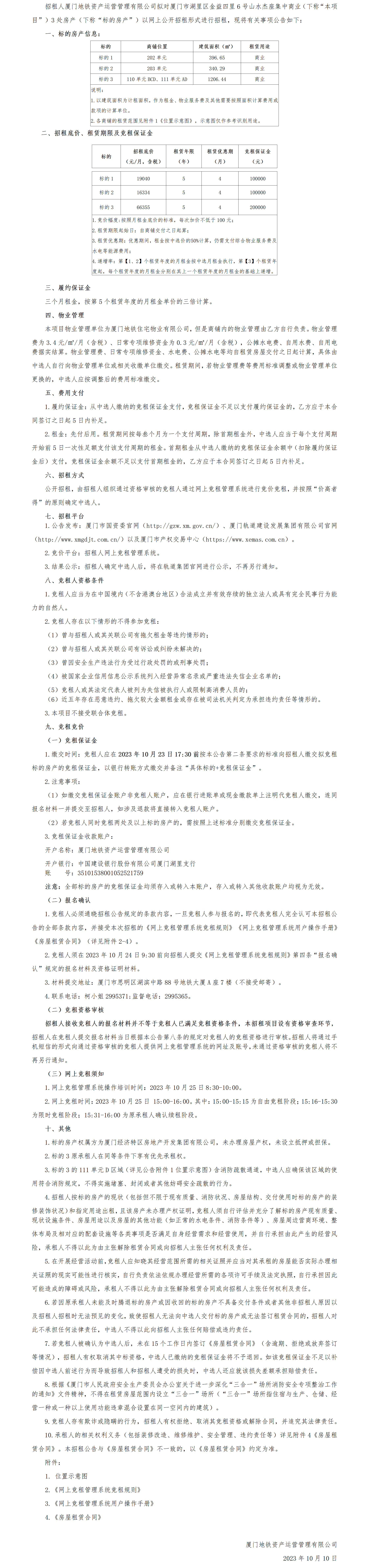 厦门地铁资产运营管理有限公司关于厦门市湖里区金益四里6号山水杰座集中商业3处房产招租公告