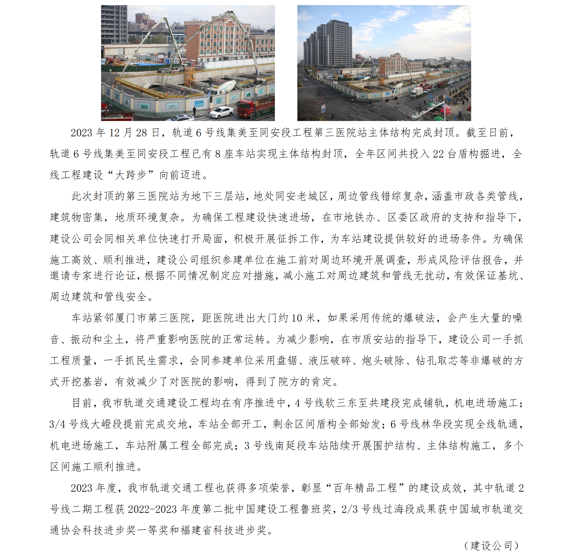 轨道6号线集同段第三医院站主体结构封顶