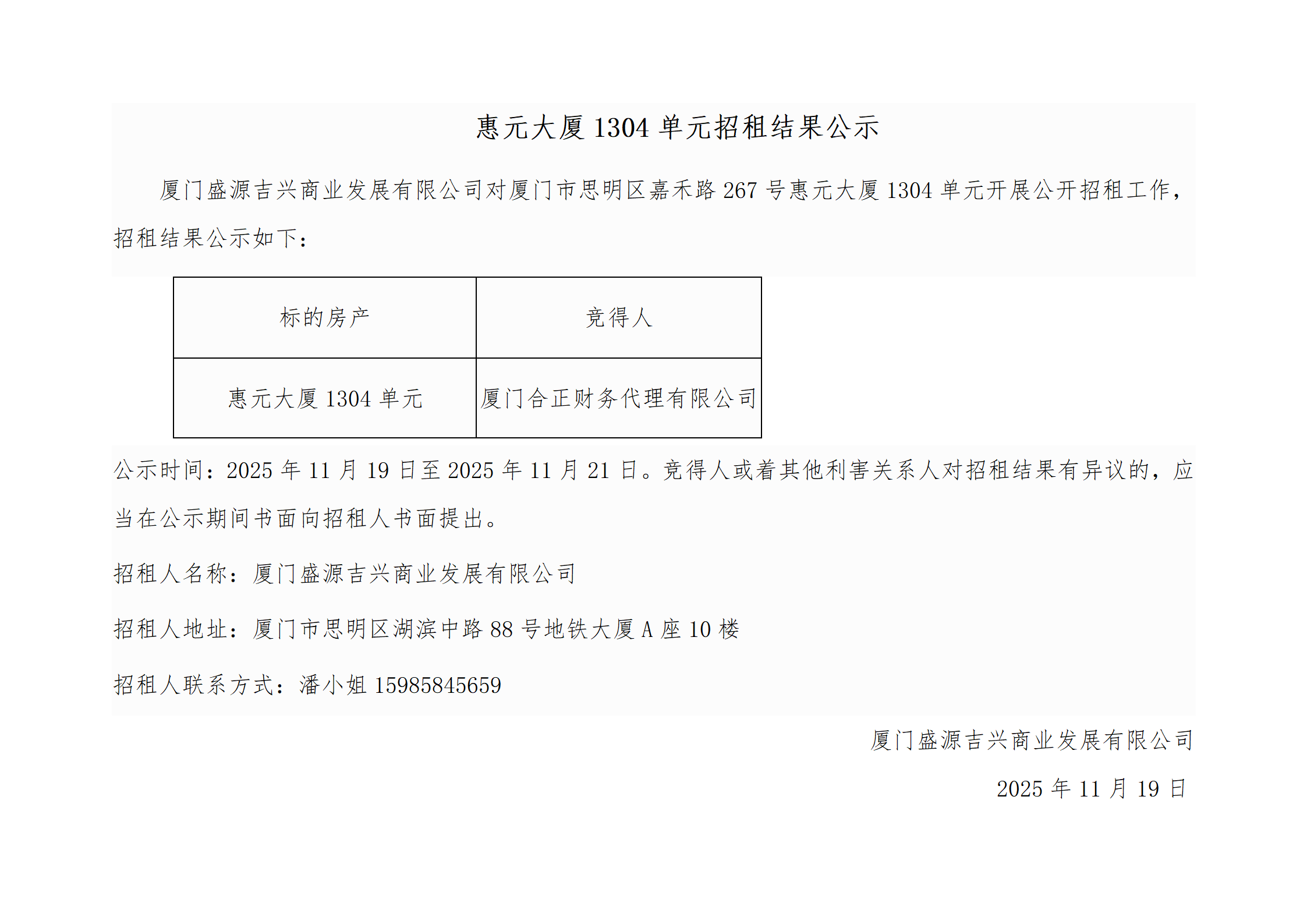 关于厦门市思明区嘉禾路267号惠元大厦1304单元招租结果公示