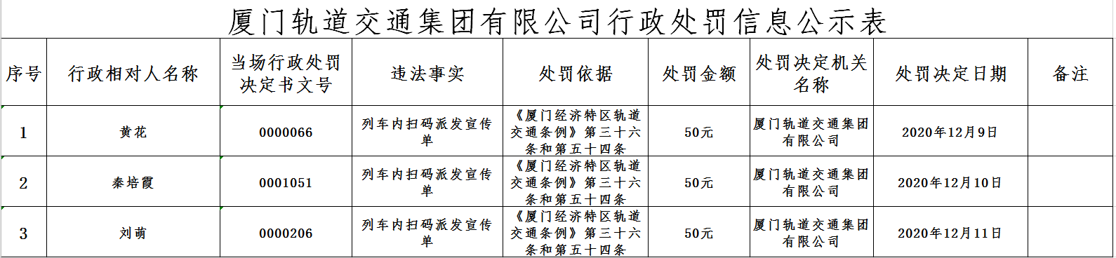 厦门轨道交通集团有限公司行政处罚信息公示(2020.12.11-2020.12.18)