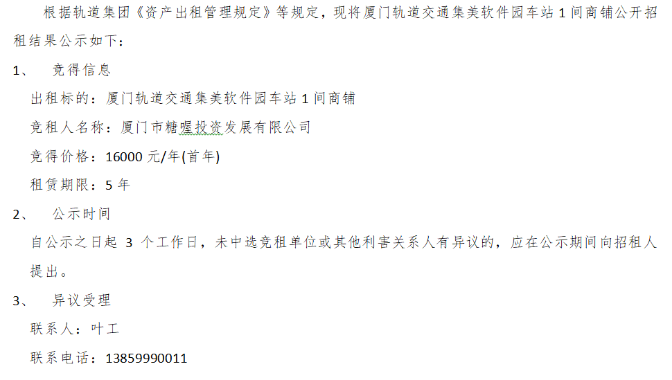厦门轨道交通集美软件园车站1间商铺公开招租结果公示