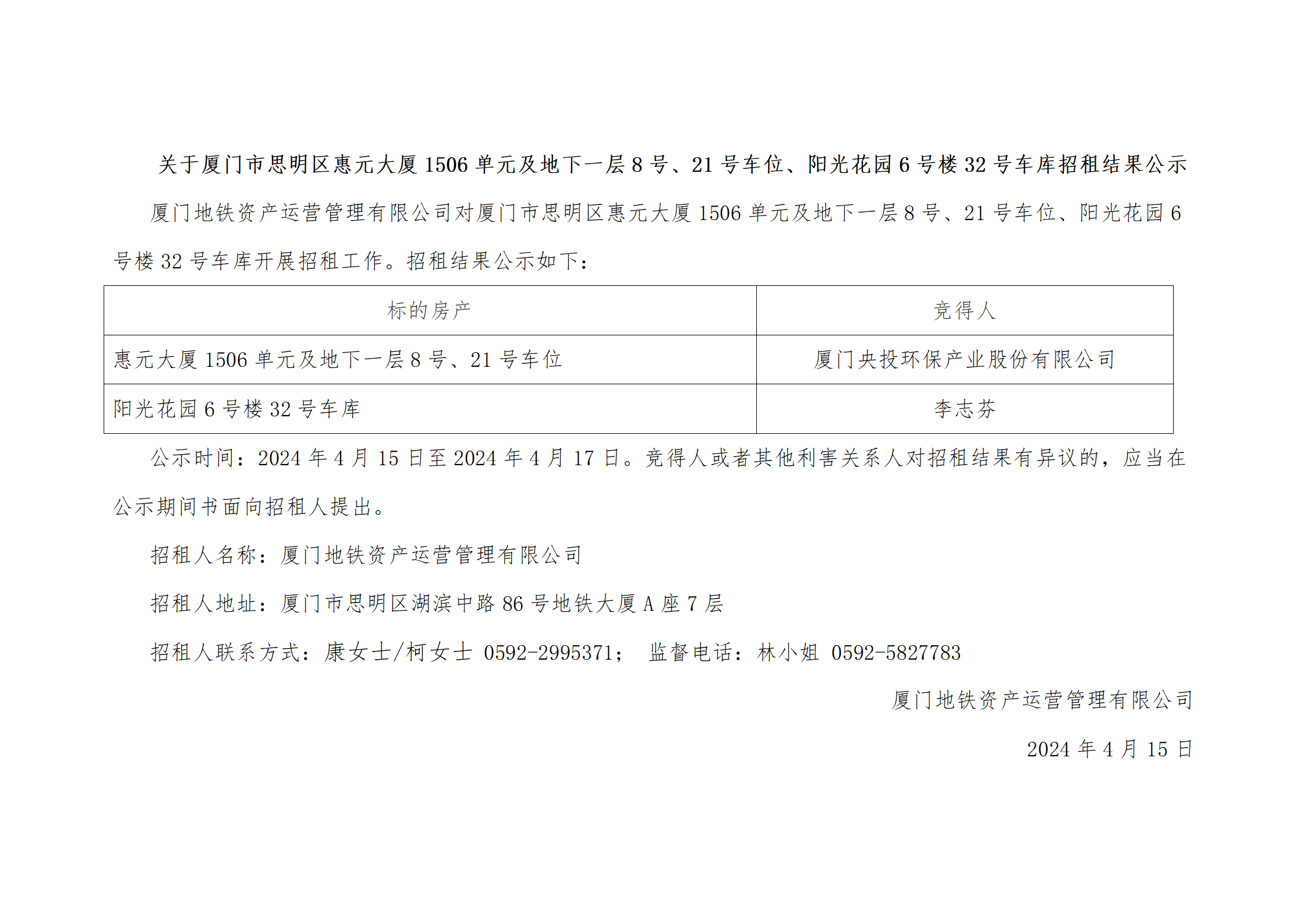 厦门地铁资产运营管理有限公司关于厦门市思明区惠元大厦1506单元及地下一层8号、21号车位、阳光花园6号楼32号车库招租结果公示