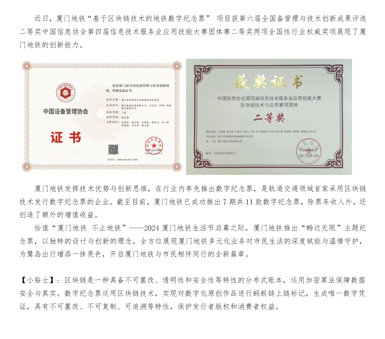 厦门地铁 地铁数字纪念票获全国行业权威奖