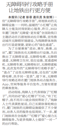 本报讯(记者 彭菲 通讯员 朱俊博)一份“无障碍导行攻略手册”,将地铁站的无障碍设施一一列明;温暖的“小红帽”让残障人士能及时得到贴心服务。昨日,2022年厦门地铁“无障爱·更有爱”全国助残日主题活动在吕厝地铁站拉开帷幕,宣传推动城市无障碍环境建设,为残障群体地铁出行打造更便捷、更贴心的“绿色通道”。