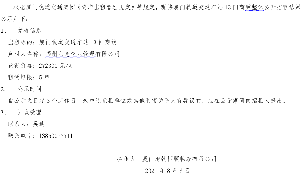 厦门轨道交通车站13间商铺整体公开招租结果公示