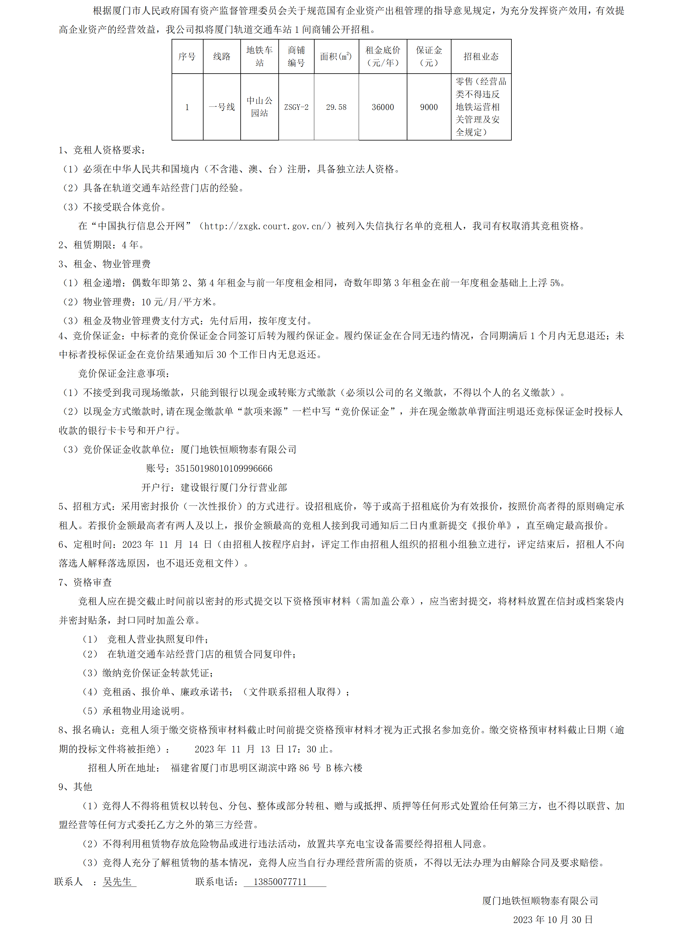 厦门轨道交通车站1间商铺公开招租公告