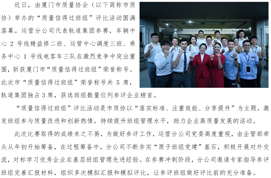 喜讯!轨道集团3个班组荣获厦门市“质量信得过班组”荣誉称号
