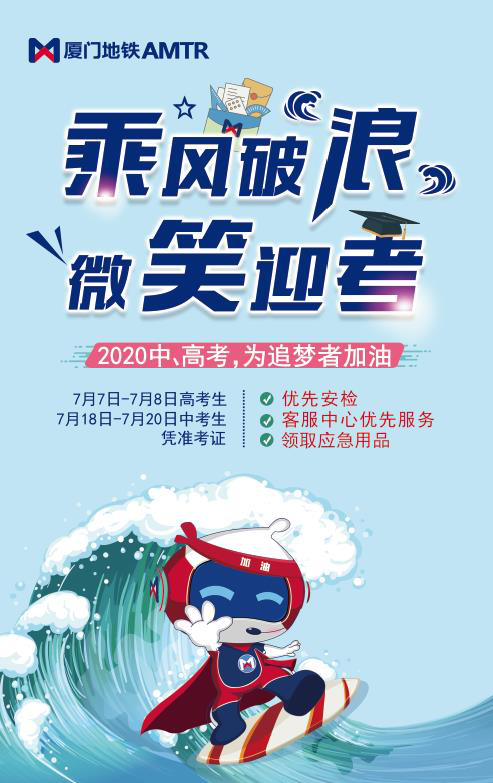 为更好地助力学子赴考,厦门地铁和BRT场站将在高考(7月7日-8日)、中考(7月18日-20日)期间推出“助力中高考”服务活动,涵盖祝福广播、温馨提示、考生服务驿站、应急文具、防疫口罩、考生绿色通道等特色服务,为广大考生加油打气!